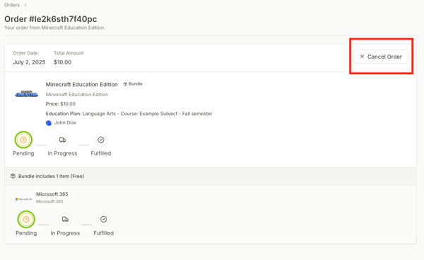 If the order is still pending (meaning that it hasn’t been approved/fulfilled yet), you’ll see a Cancel Order button in the top right corner.