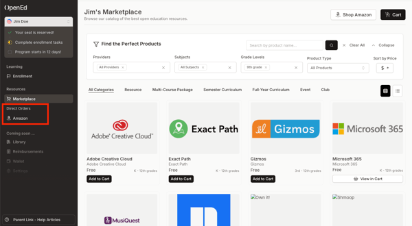 To supplement your student’s education, you can place direct orders for materials through approved vendors like Amazon and Rainbow Resource – straight through the OpenEd platform.