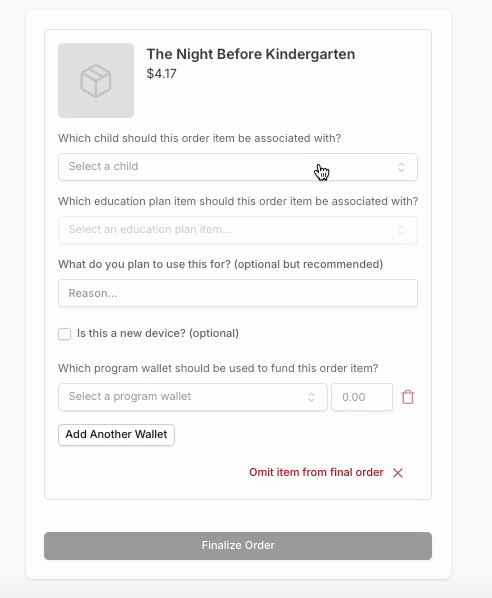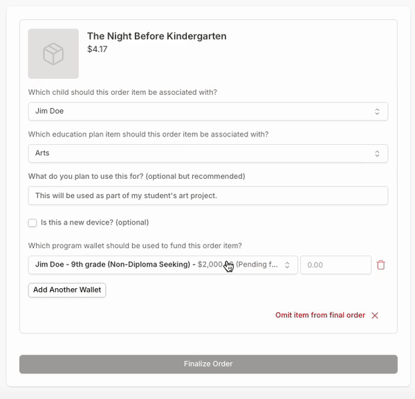 You'll be asked to associate each item with a subject on your student’s education plan so our team has a sense of how your purchases relate to your family’s learning.