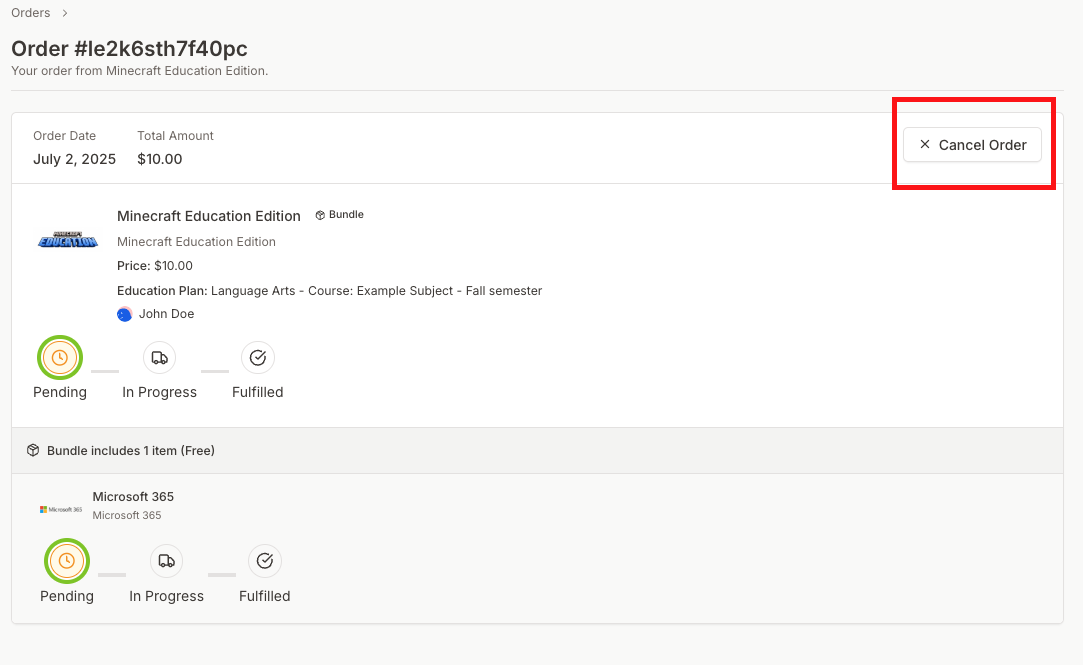 If the order is still pending (meaning that it hasn’t been approved/fulfilled yet), you’ll see a Cancel Order button in the top right corner.