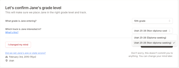 On that grade confirmation screen, you'll be asked what track your student is interested in. From the dropdown menu, you can select either diploma-seeking or non-diploma-seeking.