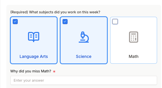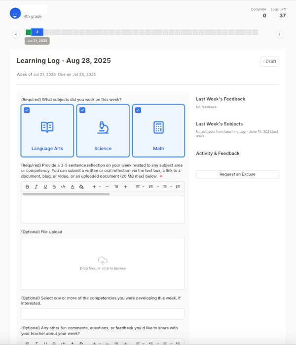 If your student unchecks a subject, they’ll be asked to explain why they missed that subject for the week. (This info is just for your teacher’s reference – as long as your student’s learning log is submitted with their 3-4 sentence reflection, they’ll be marked as attended for the week.)