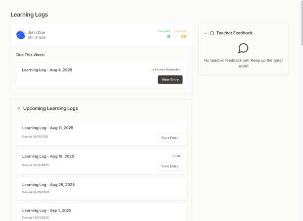 On this page, you can see all of your student’s upcoming learning logs, their due dates, and their status.