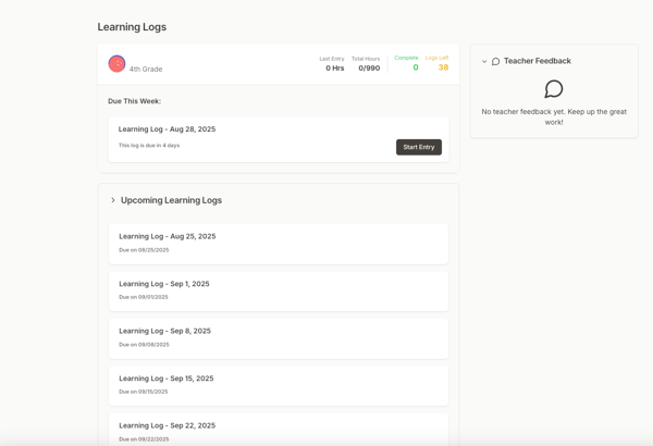 On this page, you can see all of your student’s upcoming learning logs, their due dates, and their status.