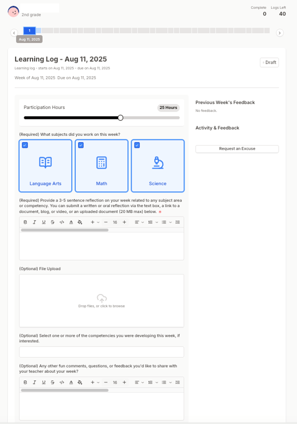 If your student unchecks a subject, they’ll be asked to explain why they missed that subject for the week. (This info is just for your teacher’s reference – as long as your student’s learning log is submitted with their 3-5 sentence reflection, they’ll be marked as attended for the week.)